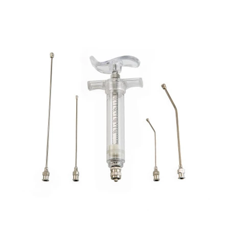 Il est composé d’une seringue avec poignée, de 2 canules droites et de 2 canules incurvées.